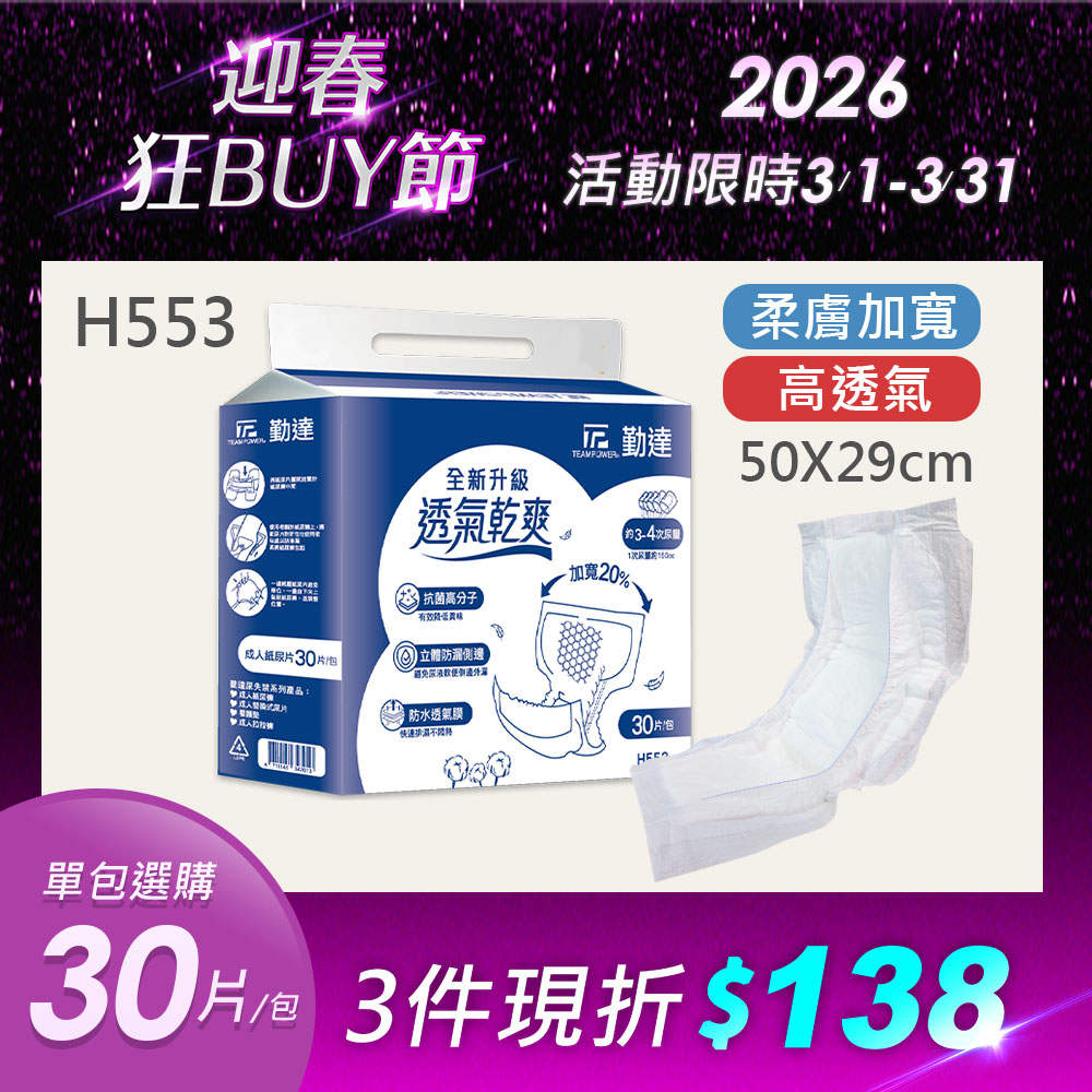 真透氣-夜用長效【勤達】乾爽-加寬成人替換尿片-30片/包(單包)-H553