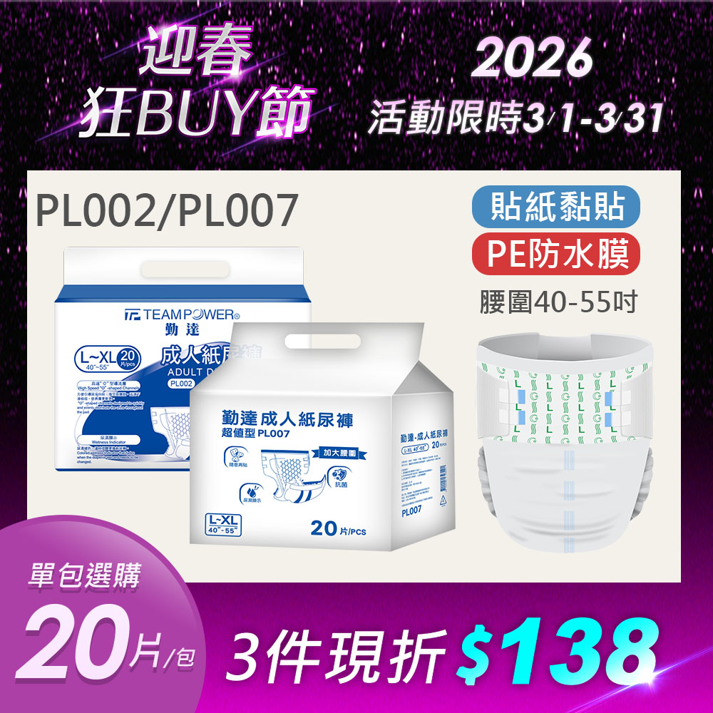 【勤達】黏貼型成人紙尿褲(L~XL)-20片/包-PL002/PL007 (O型導流層、臀部加寬)