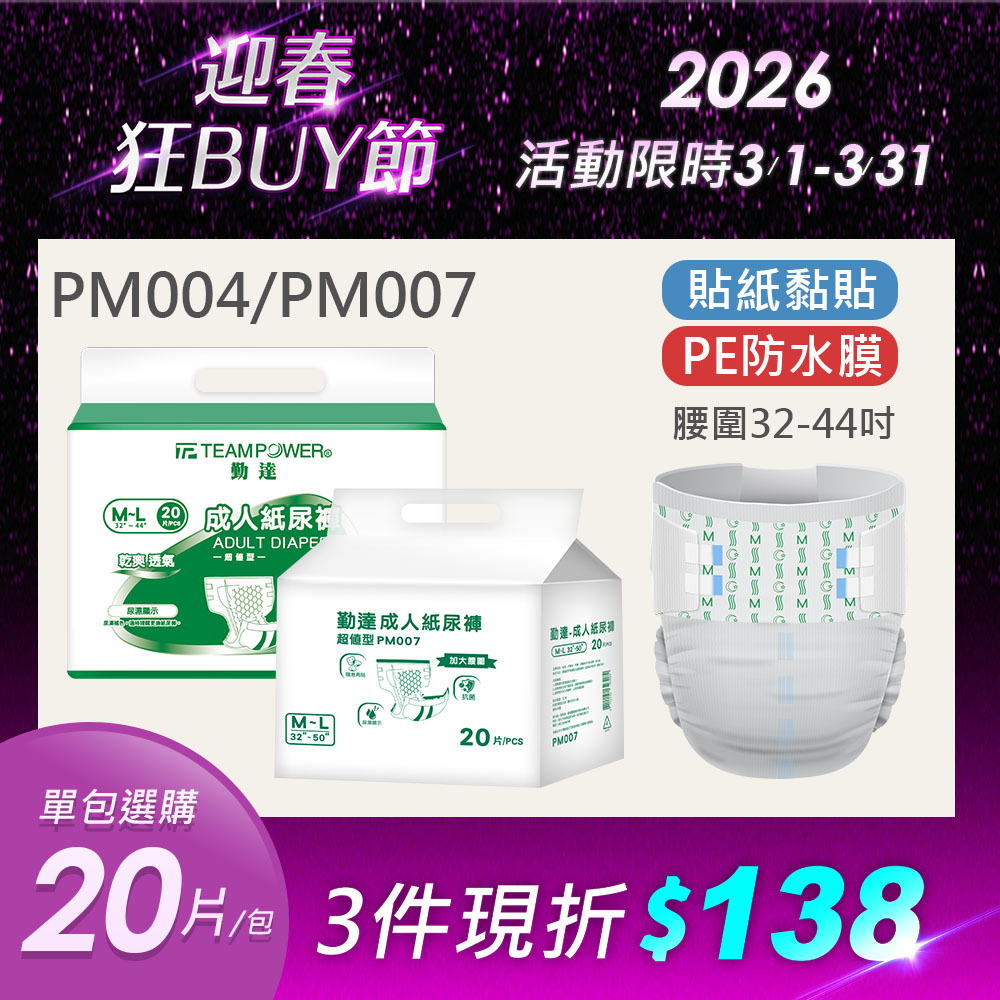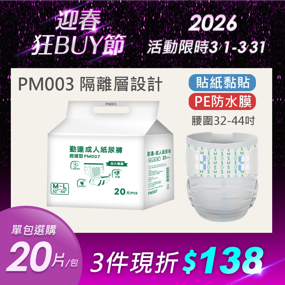 【勤達】黏貼型成人紙尿褲(M~L)-20片/包-PM004/PM007 (O型導流層、臀部加寬)