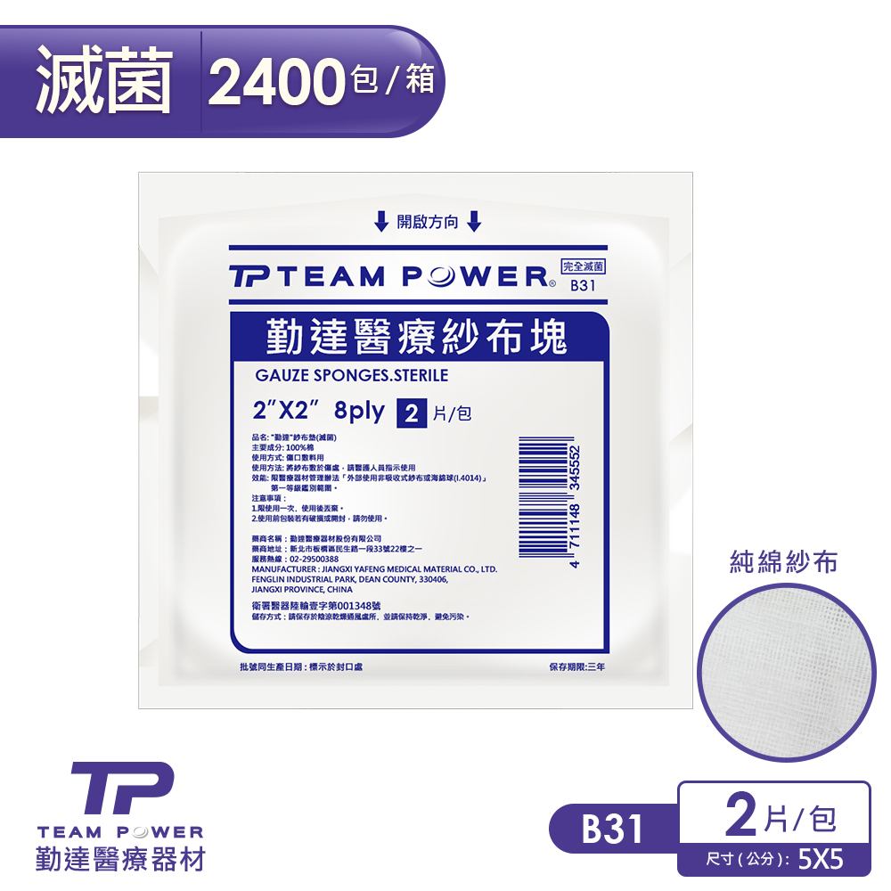 | 規格/包裝 :2X2吋(8P)滅菌純棉紗布塊2片裝/包 |
